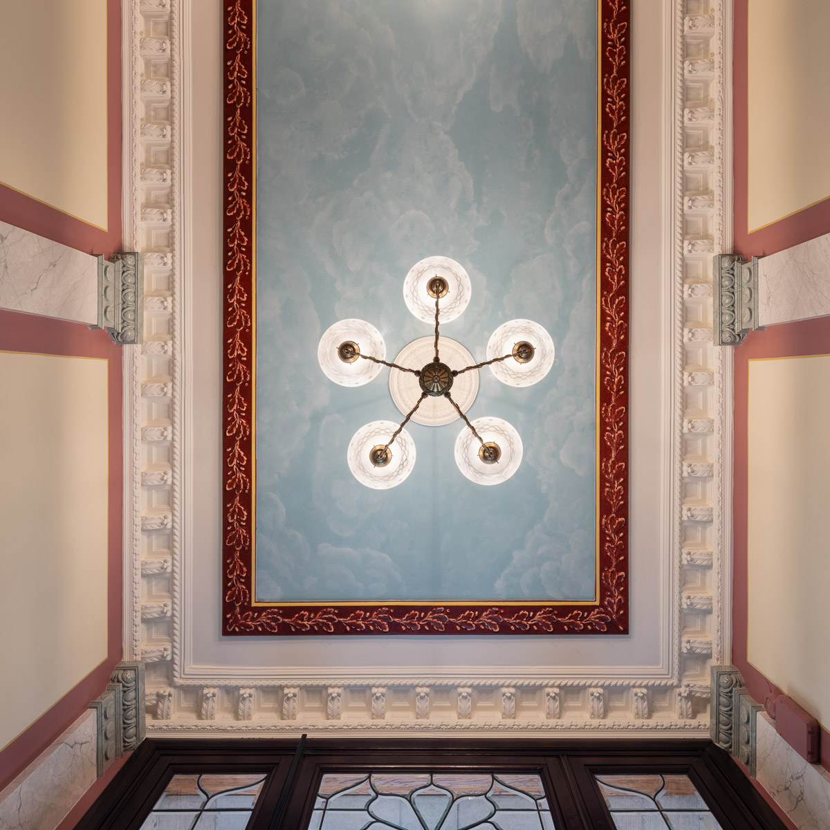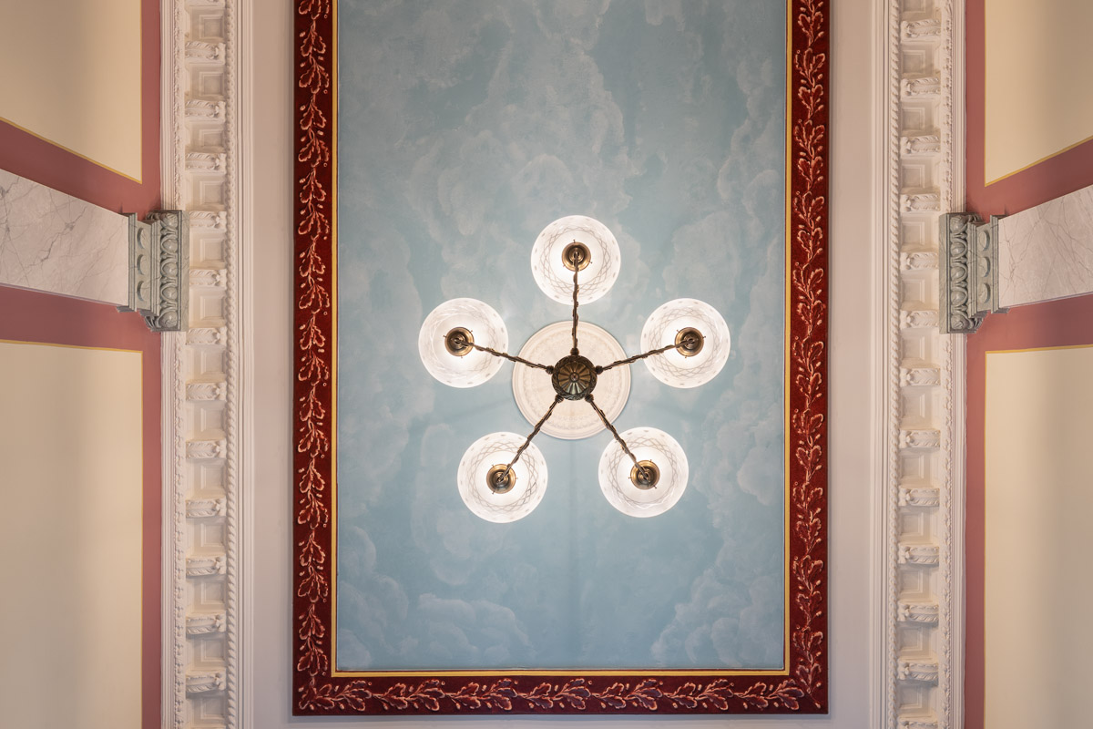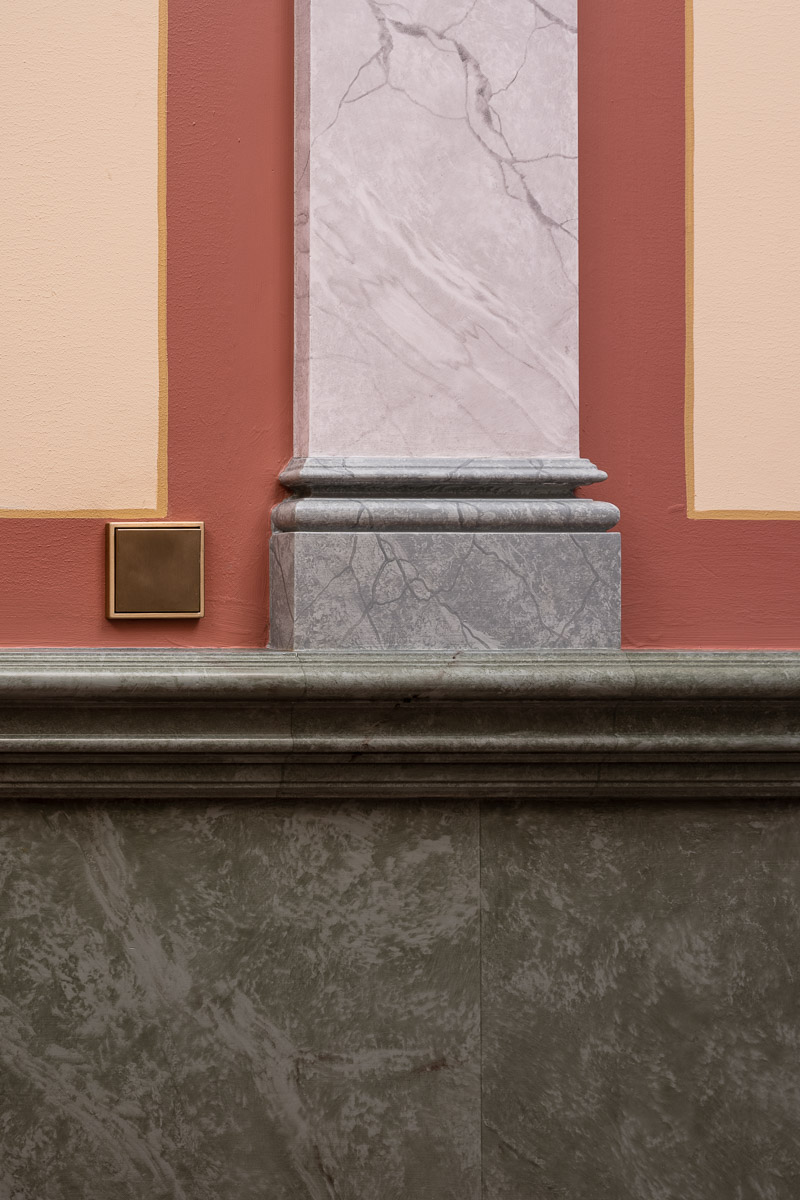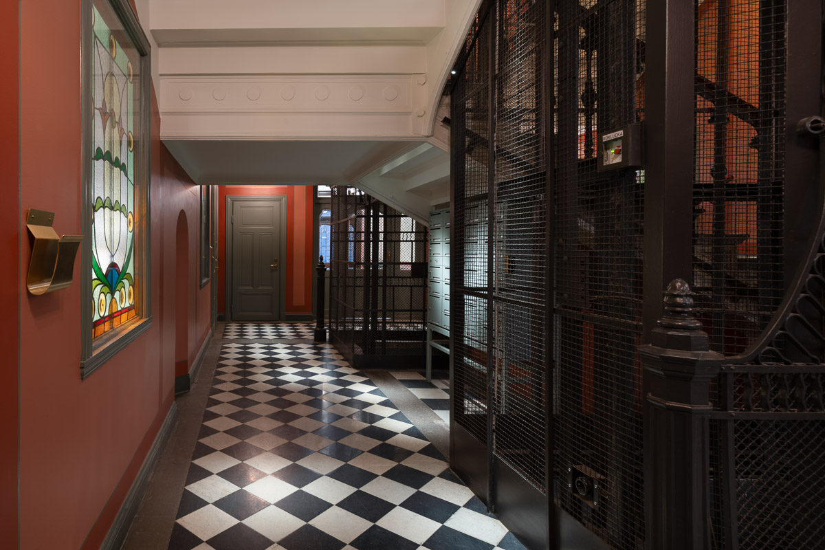 Vår ambition har varit att göra byggnadens historia synlig igen där 1880-talets klassicism och det tidiga 1900-talets jugend får samverka i ett samtida uttryck. Vi har gjort historisk research, tolkat färgerna, föreslagit kompletterande stuckaturer och tagit fram ljusdesign bland annat. Trapphuset har också genomgått en fullständig teknisk förnyelse, väl integrerad för att inte störa det arkitektoniska uttrycket.