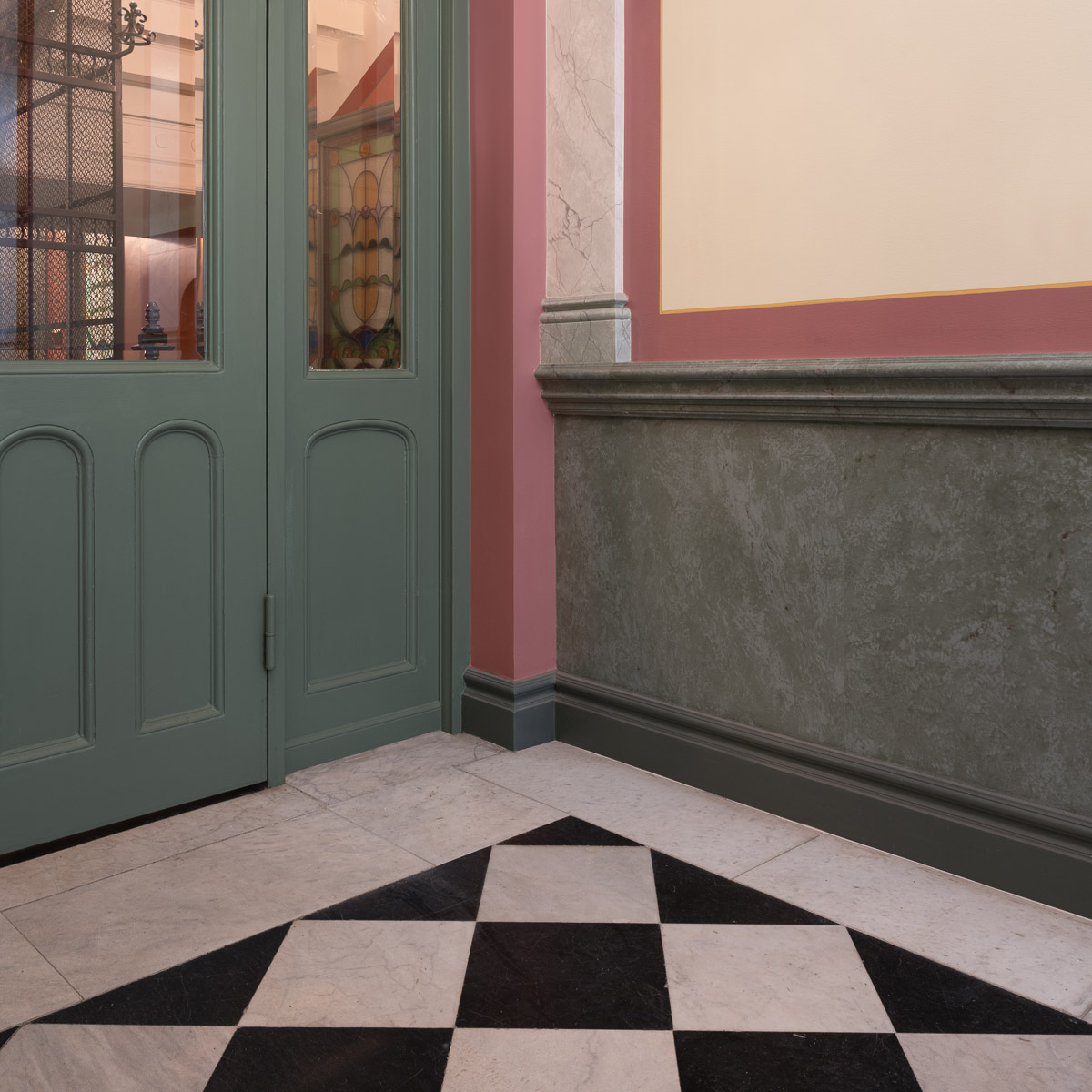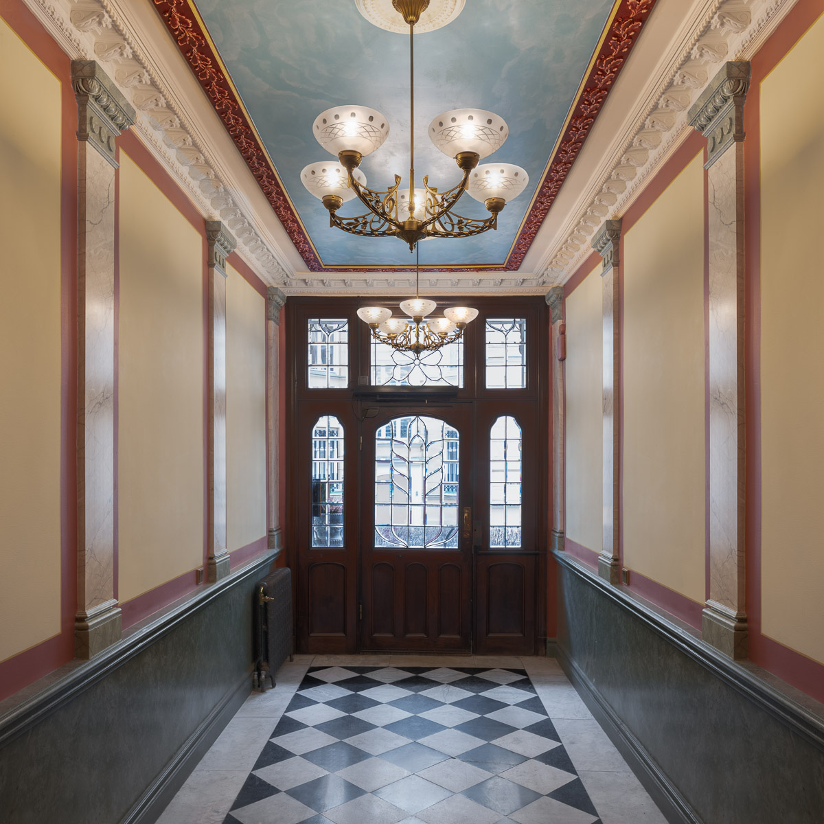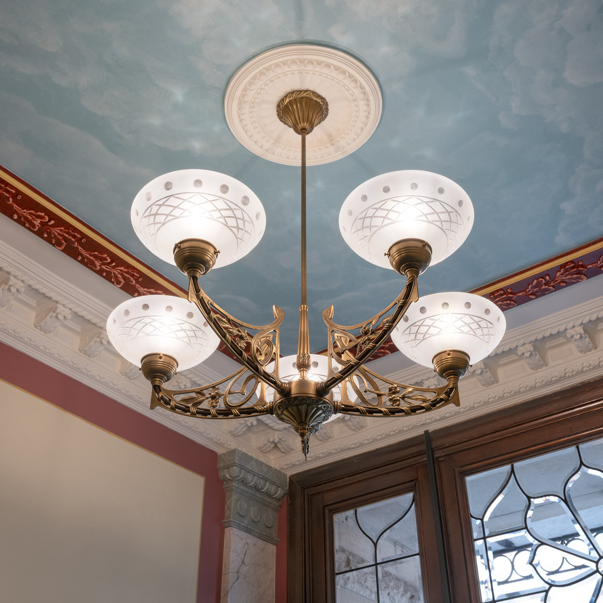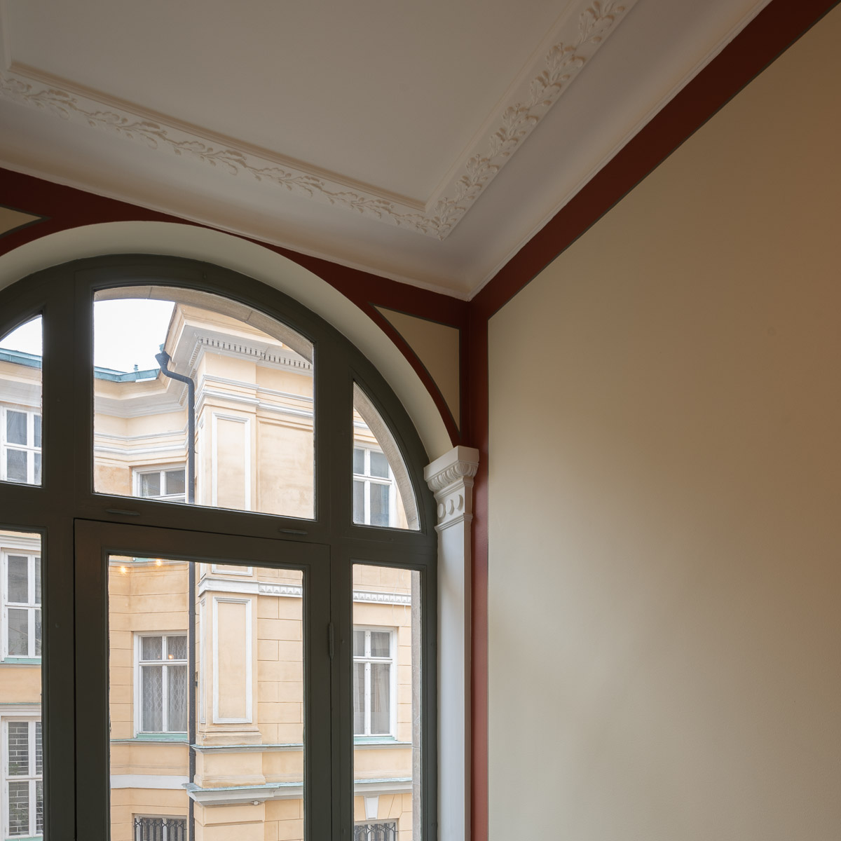 Vår ambition har varit att göra byggnadens historia synlig igen där 1880-talets klassicism och det tidiga 1900-talets jugend får samverka i ett samtida uttryck. Vi har gjort historisk research, tolkat färgerna, föreslagit kompletterande stuckaturer och tagit fram ljusdesign bland annat. Trapphuset har också genomgått en fullständig teknisk förnyelse, väl integrerad för att inte störa det arkitektoniska uttrycket.