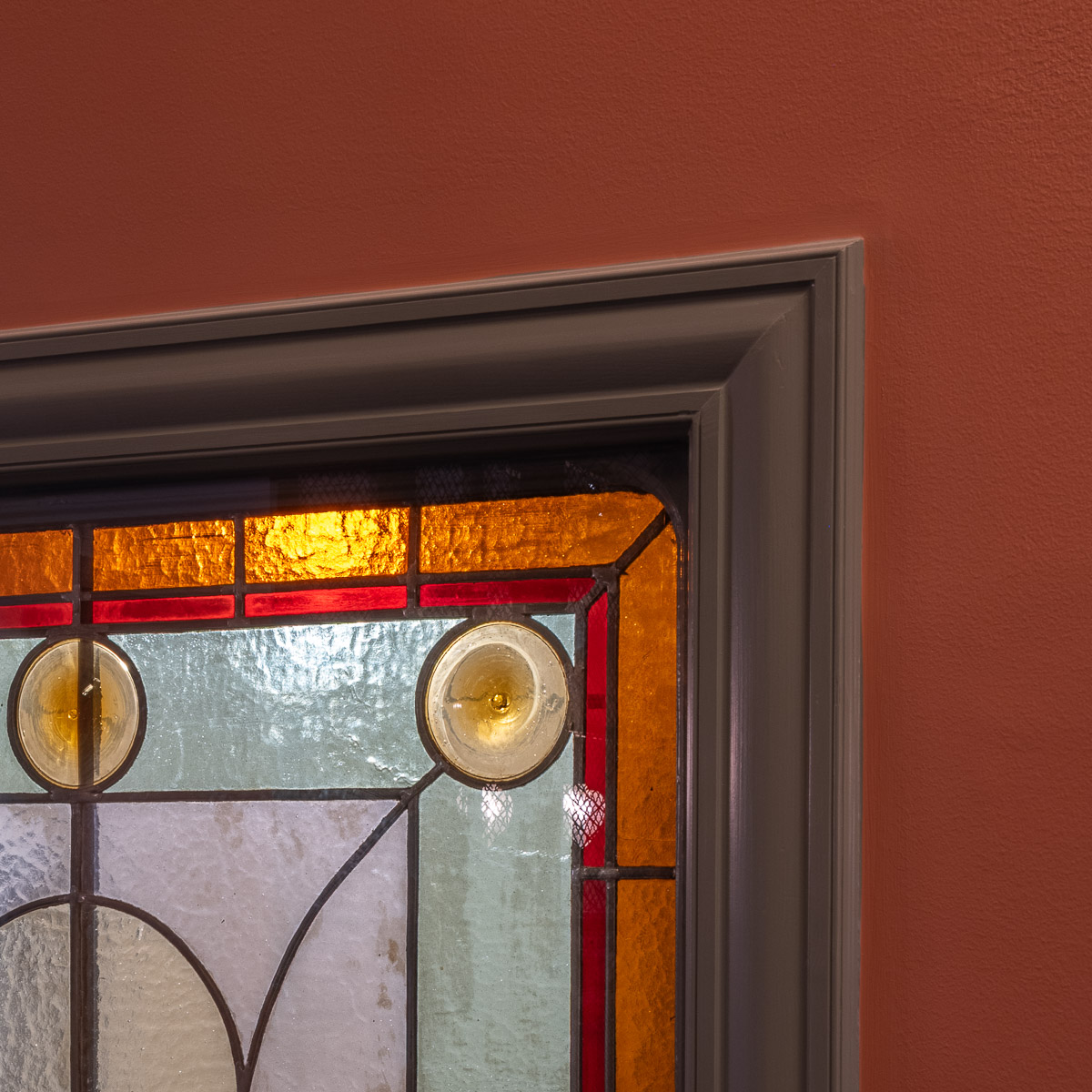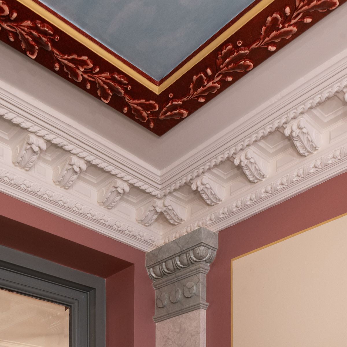 Entréerna har fått helt nya stuckaturer. Det yttre lagret är i 1880-tals stil och den specialritade kapitälen knyter an till trappans detaljer och taklisten har kompletterats med ekmotiv som refererar till husets namn. Innanför denna återfinns en list med ekmotiv som knyter an till den andra epoken, jugend. Eklisten har målats in (som enda målade stuckatur i trapphuset) i den sedan längre försvunna men ursprungliga oxblodsröda färgen. Socklarna och pilastrarna har ådringsmålats och taket har fått en dekorativ himmelsmålning.