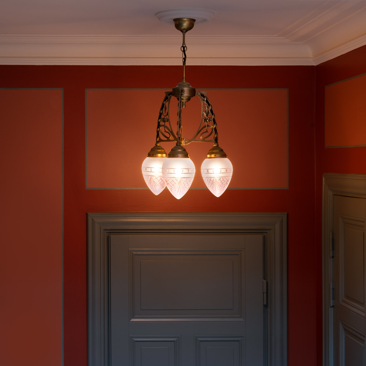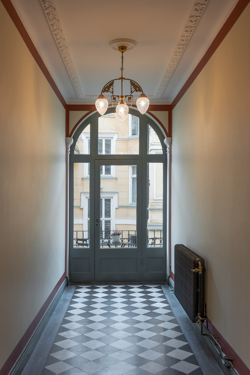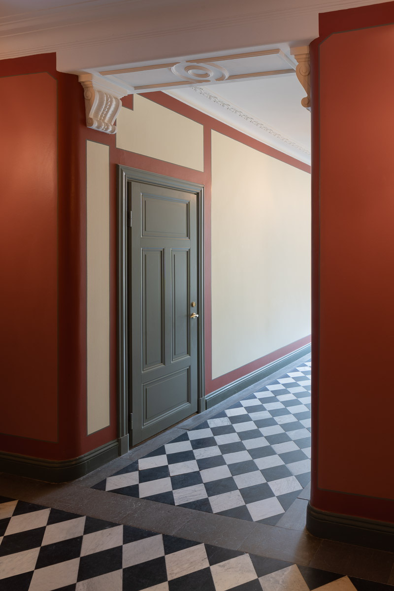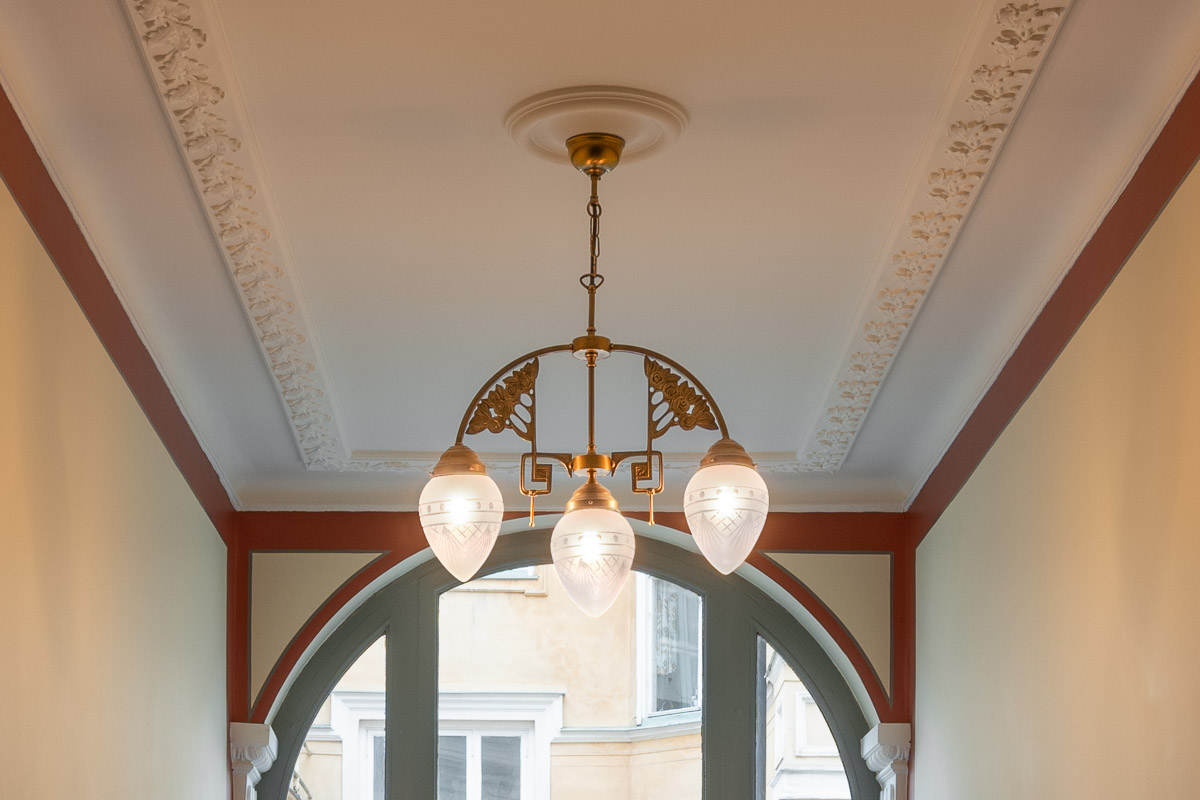 Gångarna på våning 1, som tillkom 1907, har också fått ny stuckatur. Tidstypiska spegellister, konsol och volut under balk. Jugendlisten med ekblad i taket och pilastrarna sin ramar in fönsterpartierna, återkommer i vitt.